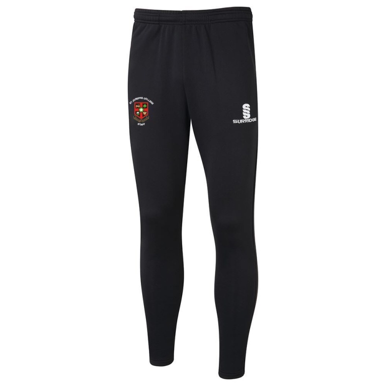 St Joseph's College Staff Tek Slim Pant Black with club embroidered badge right leg with staff underneat and option of initials printed above ss in white with 2 pockets mesh lining with slightly tapered leg